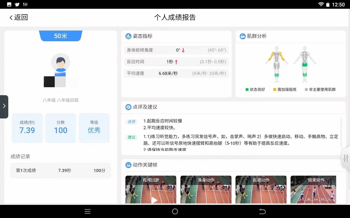 图为AI米兰操场“电子考官”为八年级学生50米短跑考试项目 实时生成的个人成绩报告,可大大减少老师们的成绩统计时间、人力成本,提高考试工作效率。